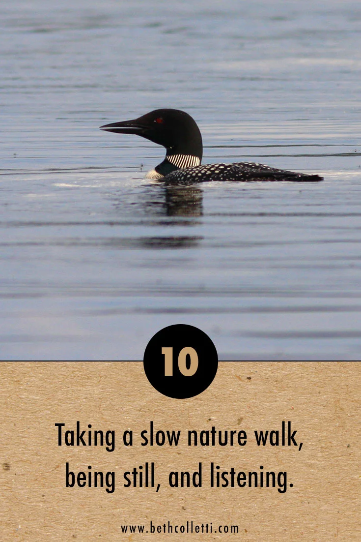 My husband and I have a favorite spot along a local creek where we go to listen to marsh wrens, redwing blackbirds and bullfrogs sing their summer songs. Taking nature walks and keeping our eyes and ears out for wildlife is one of our simple joys. Later this month we will be heading to the Adirondack Mountains for a lake vacation. There is nothing quite like hearing the sounds of loons croon and bald eagles chitter across the water in the foggy mornings.