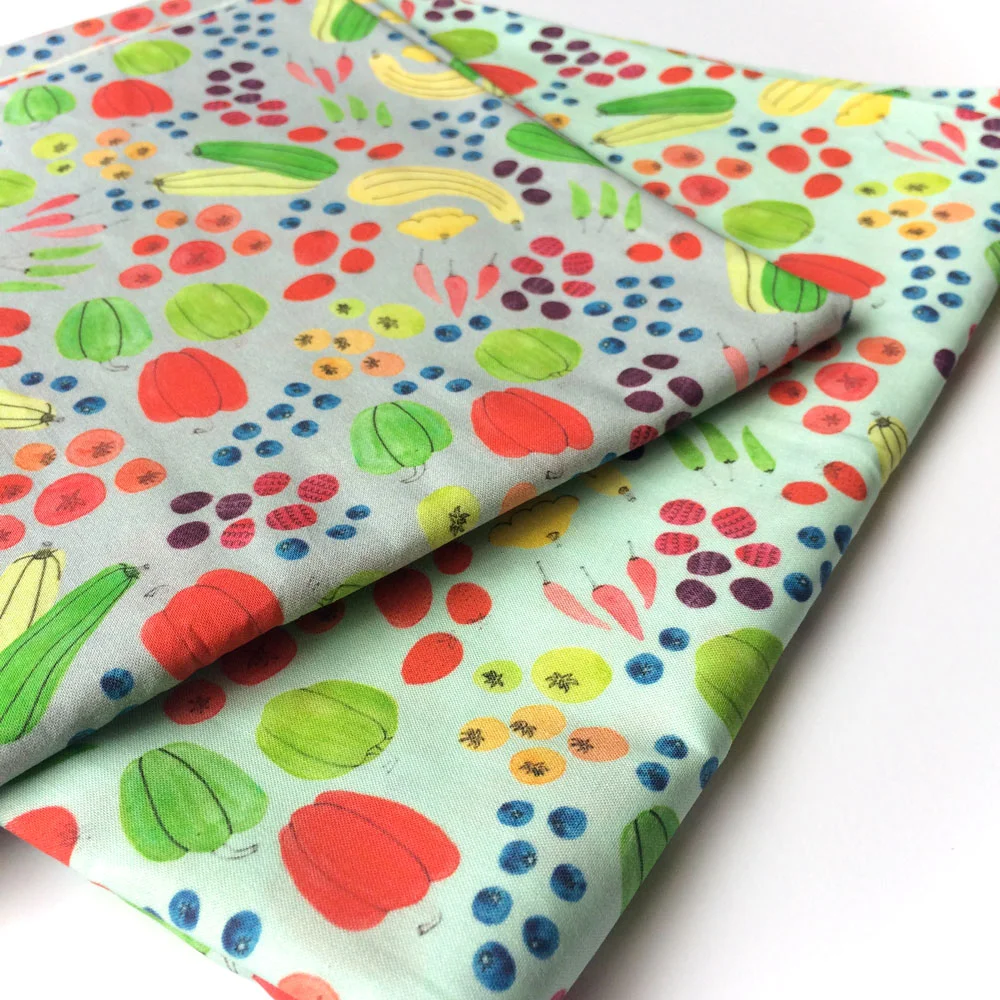 I shared in my last post how I’m loving the new fabric Yuko Miki of Honeyberry Studios has created with her illustrations! As a gardener and fruit and veggie lover, I was a fan of Yuko’s Eat a Rainbow illustration as soon as I saw it. (I even bought a set of notecards featuring her designs!) So I knew her similar fabric, available on Spoonflower, would be perfect for some veggie garden inspired embroidery patterns.