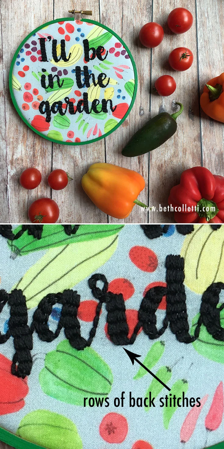 As an alternative, the back stitch can be used as a fill stitch rather than to create a single line or an outline. If you are new to embroidery, or you aren’t a fan of the satin stitch, this can be a nice alternative to stitching thicker letters, though it is more time consuming and uses more embroidery floss. Below I used the back stitch to fill in the letters by stitching line after line next to each other. I tried to line up each segment of the back stitch so the stitches had an even appearance, and I’m pretty happy with how they turned out in this “I’ll be in the garden” pattern.