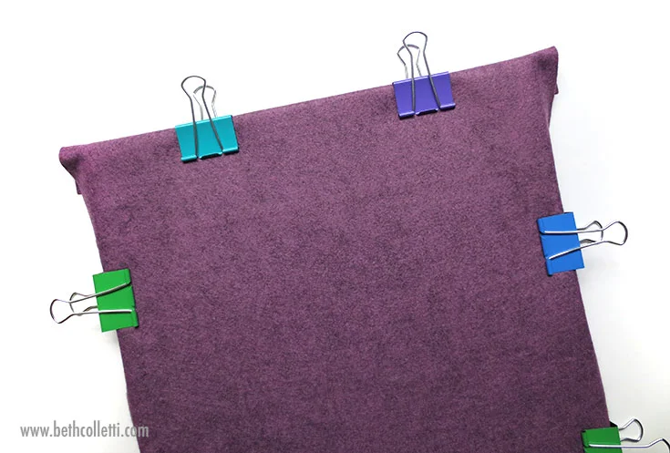 Once you’ve pressed your felt background, lay it on your work table and put your canvas face down on top of it. The background felt should wrap around the side so it can be glued to the back of the canvas frame. If you have excess felt, like I did, use a fabric scissors or rotary cutter to remove the extra. Next grab one of your binder clips, and wrapping one edge of the background felt around your canvas frame, clip it in place along each edge of the frame. Repeat this with each of the four sides, tightening the felt as needed. You want your background fabric to be free of wrinkles.