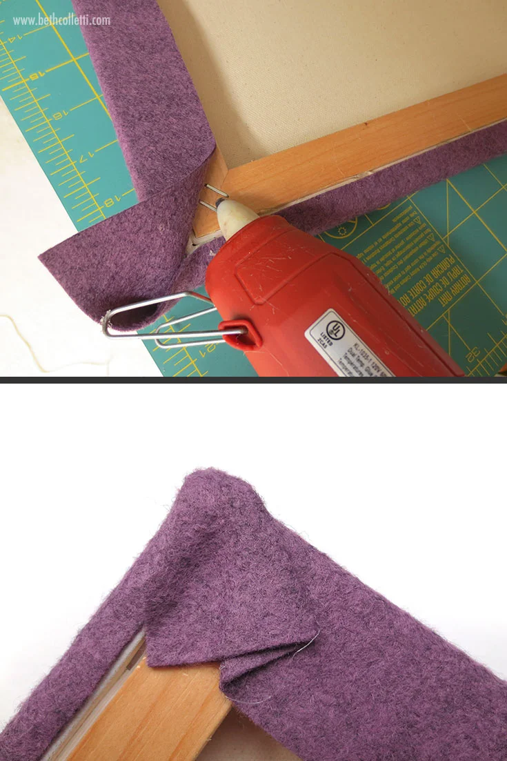 Grab your hot glue gun and begin gluing the edge of your felt down on the back of your canvas frame. For best results, glue on opposite sides (ie - first glue the top, then the bottom, then each side), rather than gluing around in a circle. Fold down each corner and glue the felt on the back of the canvas frame.