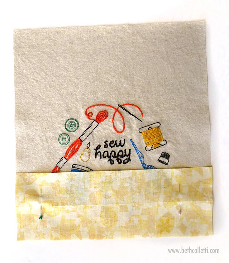Pin the 3.5” piece of fabric to the bottom of your embroidered panel (right sides together) and sew along the bottom 10” edge. Press the seams open so the fabric lays flat.