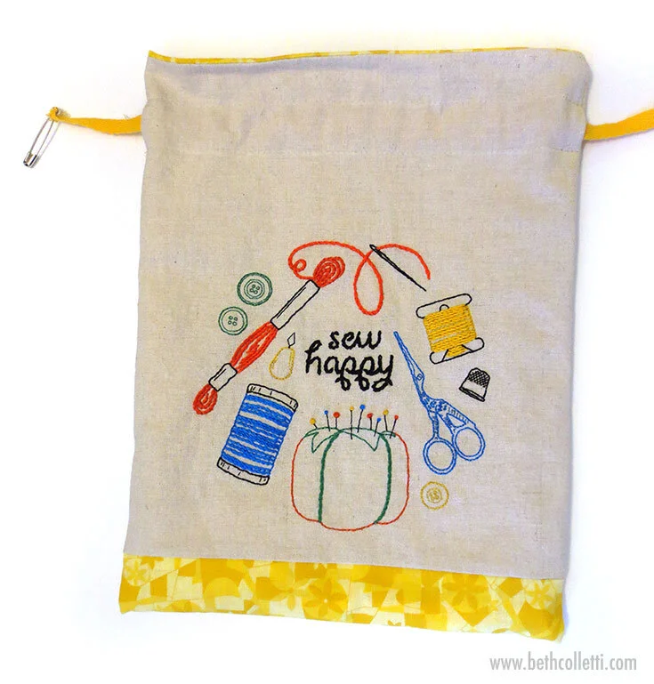 When working on any sort of sewing or stitching project, staying organized and keeping your supplies at your fingertips makes the experience that much more enjoyable. Sew up this cute drawstring project bag to store your next embroidery project when you’re not working on it. The finished size is 9.5” wide x 12” high and perfect for an 8-inch embroidery hoop and all of your other supplies and notions.