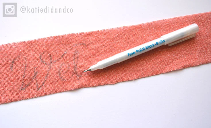 1. Take the 2-1/2" inch ribbon and cut off approx. 12” section and trace the “Welcome” pattern onto the ribbon using the chalk pen or water soluble pen. Download the Welcome pattern here.