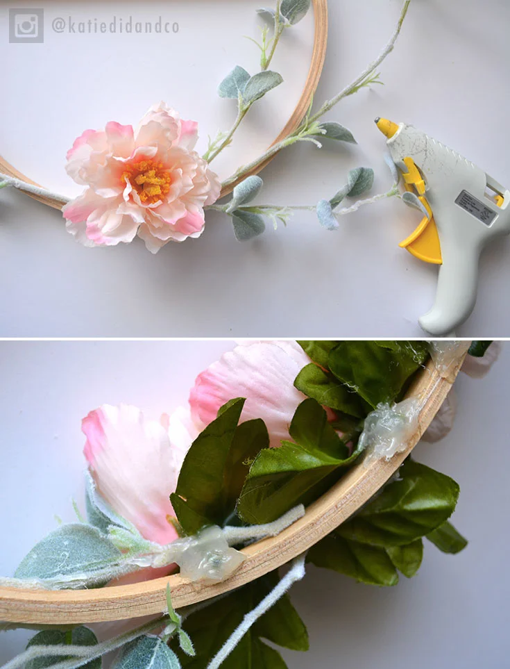 5. Next I arranged the leafy greens on the side of the hoop, leaving space in the middle for the pink flowers. I tried to plan out how I wanted to arrange the greenery and clipping off branches where I needed prior to gluing it down. Once I was happy with how it was laying I glued everything down with the hot glue gun. You could probably use floral tape/wire for this but I decided I’d use what I had on hand, and I used a TON of glue and really gooped it on.