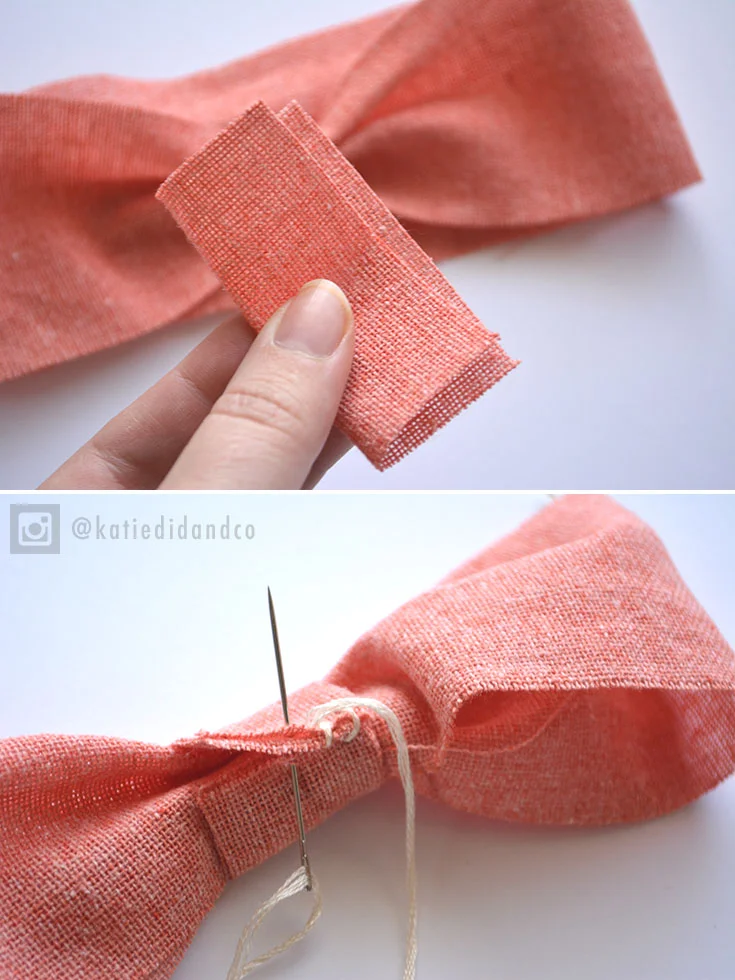 9. I then cut of about 2” piece of ribbon and folded in half, wrapping it around the middle of the bow. Sewing the ends of the loop together in the back of the bow.