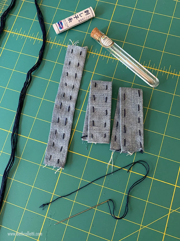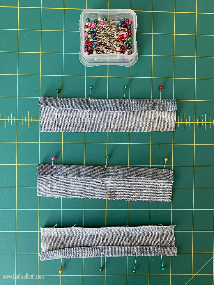 For my denim loops, I folded ½ inch of the 2x6 inch fabric over each of the long sides and pinned it in place, leaving me with a strip of fabric that was 1 inch wide and 6 inches long. Next I hand sewed a running stitch along the 6-inch-long edges to secure the raw fabric. I chose to stitch with Olympus Sashiko thread on my loops to match some thread in my project. You can also machine sew the edges of your loops if you prefer.