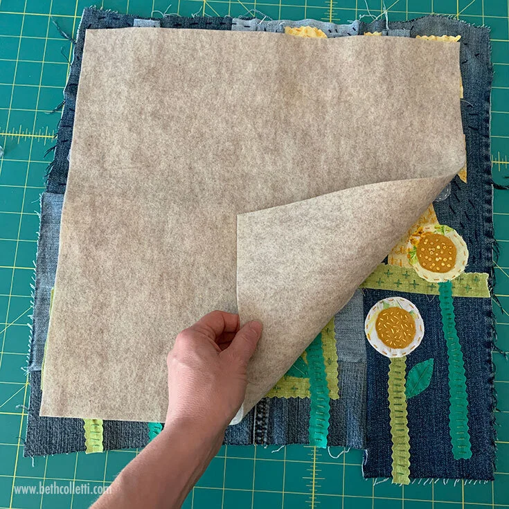 I wanted my finished boro project to be 14x14 inches square so I designed it with some extra fabric on the edges, knowing I’d be hiding those on my finished design. I also decided I wanted to machine sew my backing to my boro project. So I cut my felt backing fabric to be 14.5x14.5 inches square (this included a ¼ inch seam allowance on all sides.)