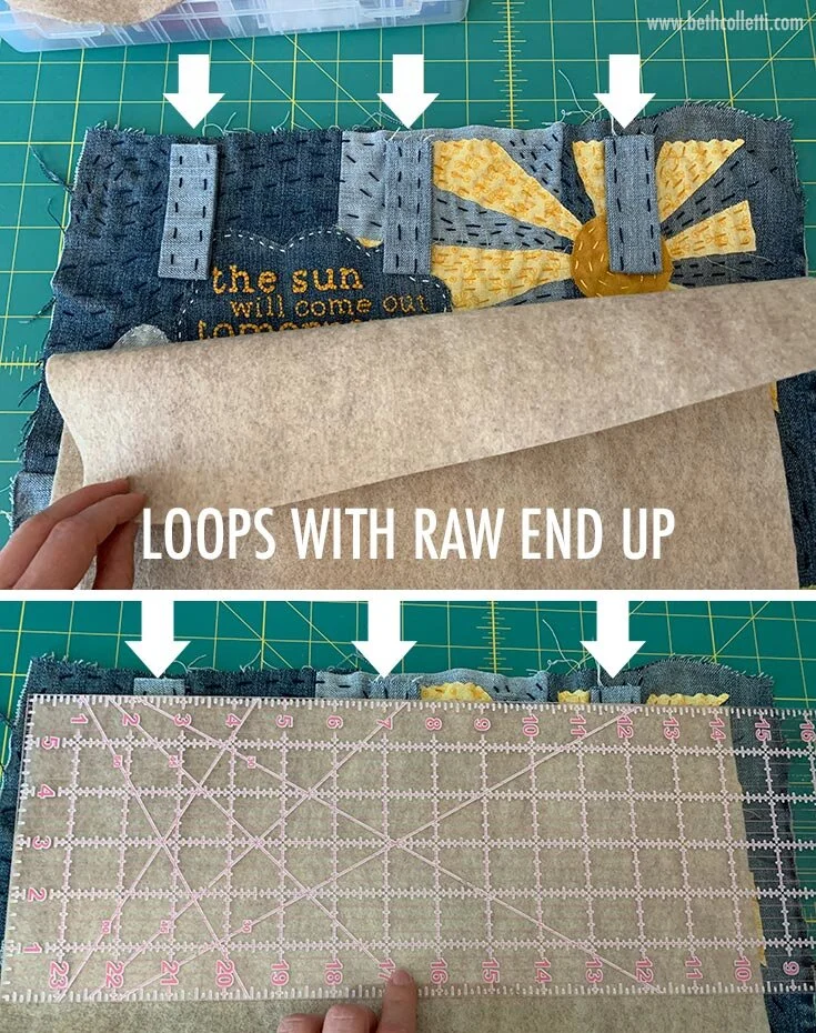 Each loop should sit between your two pieces of fabric with the open, raw edge of the loop pointing up and the closed end of the loop pointing down. Keep in mind that we will machine sew three sides of our art, and then turn it right-side out before finishing the last edge. I positioned my loops so about ¼ inch of their raw edges were sticking out beyond my backing fabric so they would be secure when I turned the project right-side out.