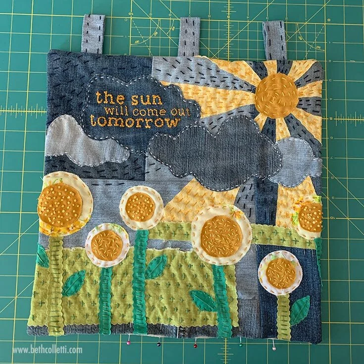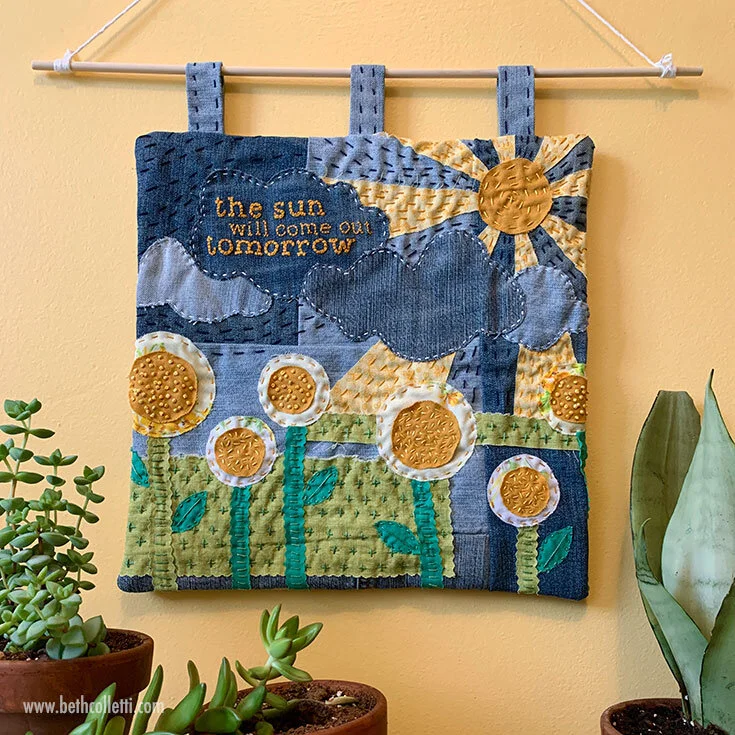 Because I used denim for my boro project, I figured its heavy weight and stiffness would hold it’s shape well when hanging from just three loops at the top of my art. If you have used a lighter weight fabric for your project and are concerned about it flopping or folding, consider using more loops along the top length of your artwork.