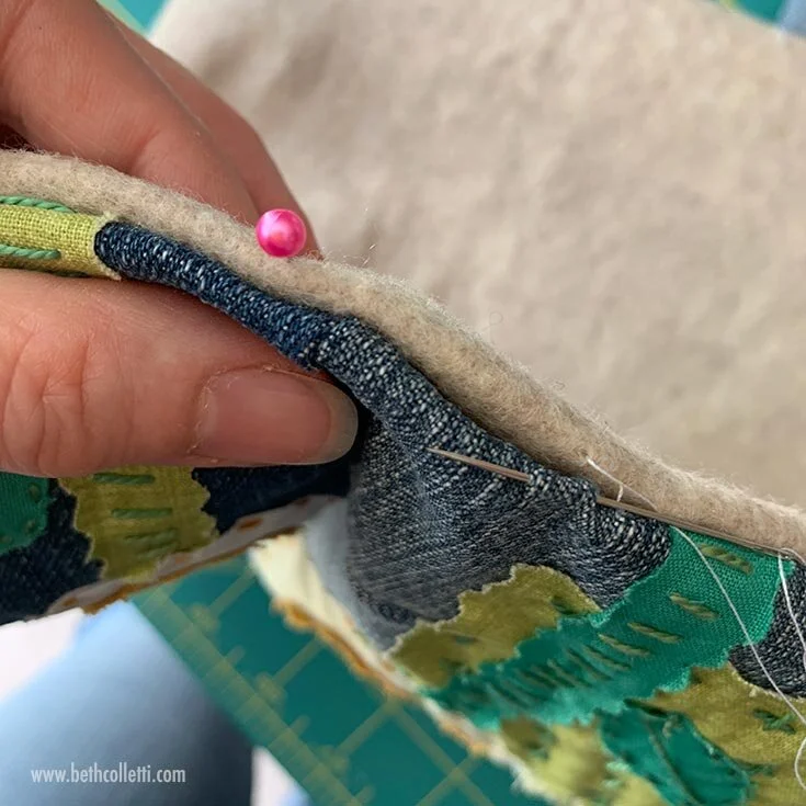 Proceed by pinning the top edge of your art, taking care to pin each loop in place. Your art should be facing right-side out with all raw edges hidden at this point. Finish by using the blanket stitch to sew around all four edges of your artwork, securing the edges and loops in place. Move on to step 5 to continue.