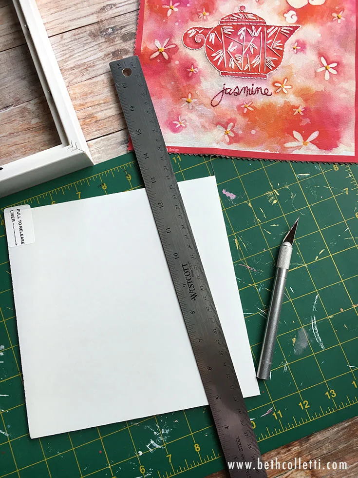 The NuCor self-adhesive mounting board I purchased came in a 9”x12” size. I like this board because it’s acid-free, thin and slightly tacky so the fabric won’t shift on it too easily. However it was too large for the 8”x8” frame as is, so I had to trim it down to size. If you can’t find this self-adhesive mounting board, another type of rigid board will do. I recommend something acid free if you can find it, and a depth of no more than ⅛” so it can fit into the back of the frame.