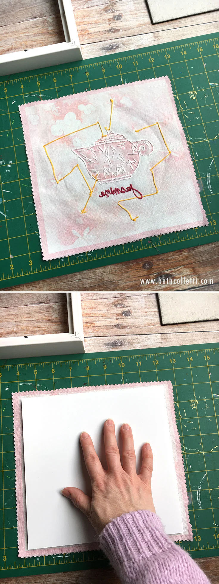Center the mounting board onto your fabric with the adhesive facing down.