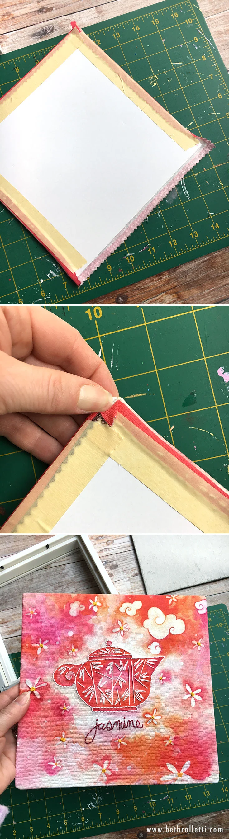 Use masking tape to secure the edges of your embroidery art on the back of the mounting board.
