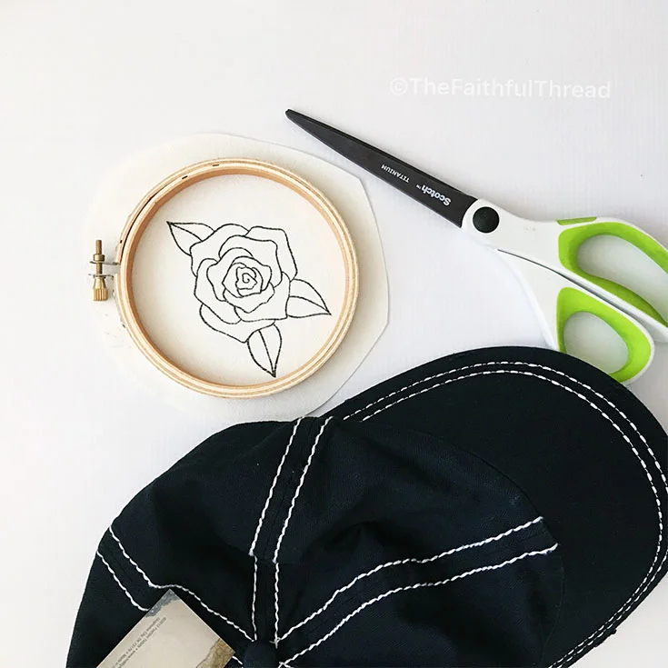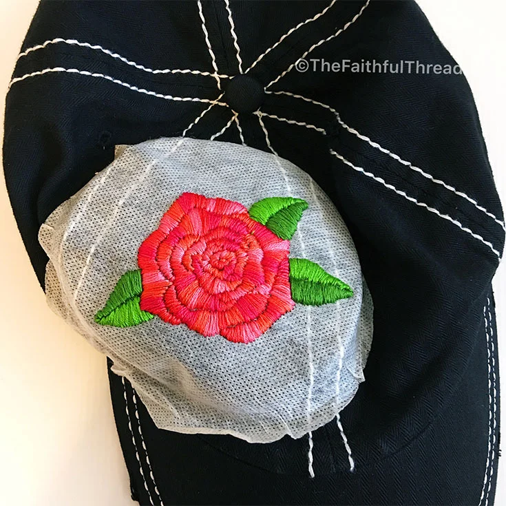 3. Remove the sticky back and position the design on your hat, making sure it’s not too close to the visor that you can’t fit the hoop. You can certainly embroider without the hoop, but I found that the final result looks much better using the hoop.