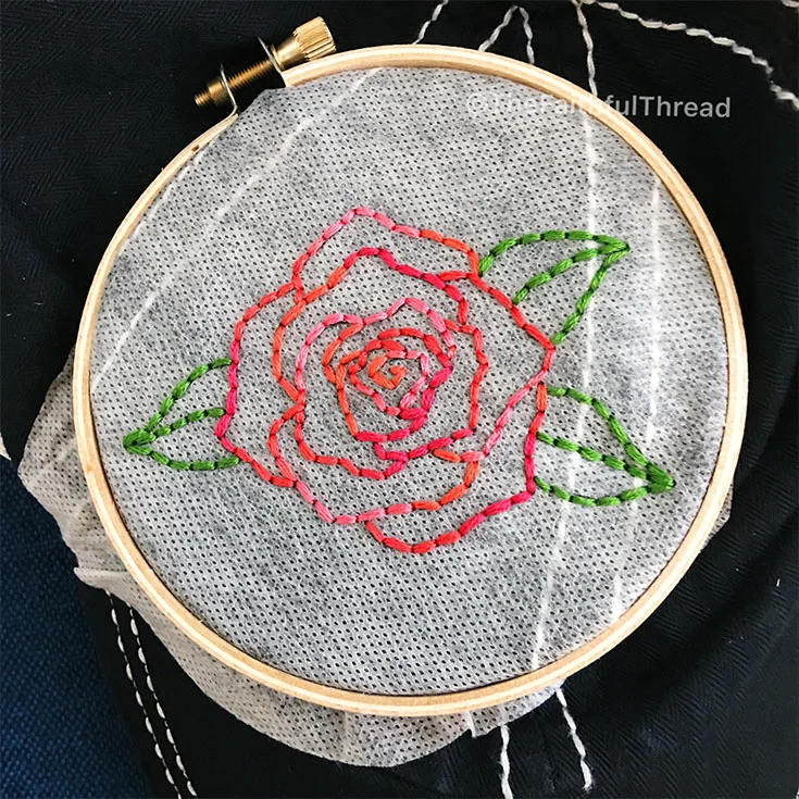 5. I like to outline the design with back stitch or split stitch before embroidering with satin stitch. You can certainly just do the outline, which looks really nice by itself. Use all 6 strands of the embroidery floss.