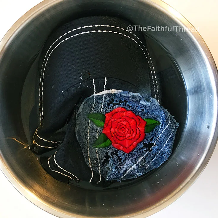 7. When you’re done, remove the hoop and soak the hat in warm water for a few minutes. The Fabri-Solvy will start breaking down immediately, but you can help it by moving the fabric around in the water.