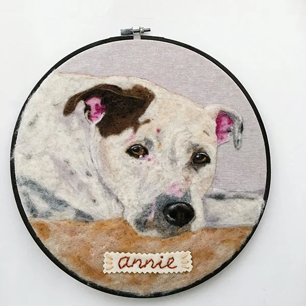 She creates custom needle felted and embroidered pet portraits with an utmost attention to the details and a goal to capture the expression and temperament of each dog or cat as true to life as possible. She loves giving thoughtful gifts and her greatest joy is to see people’s faces light up when they see their pet’s portrait for the first time.