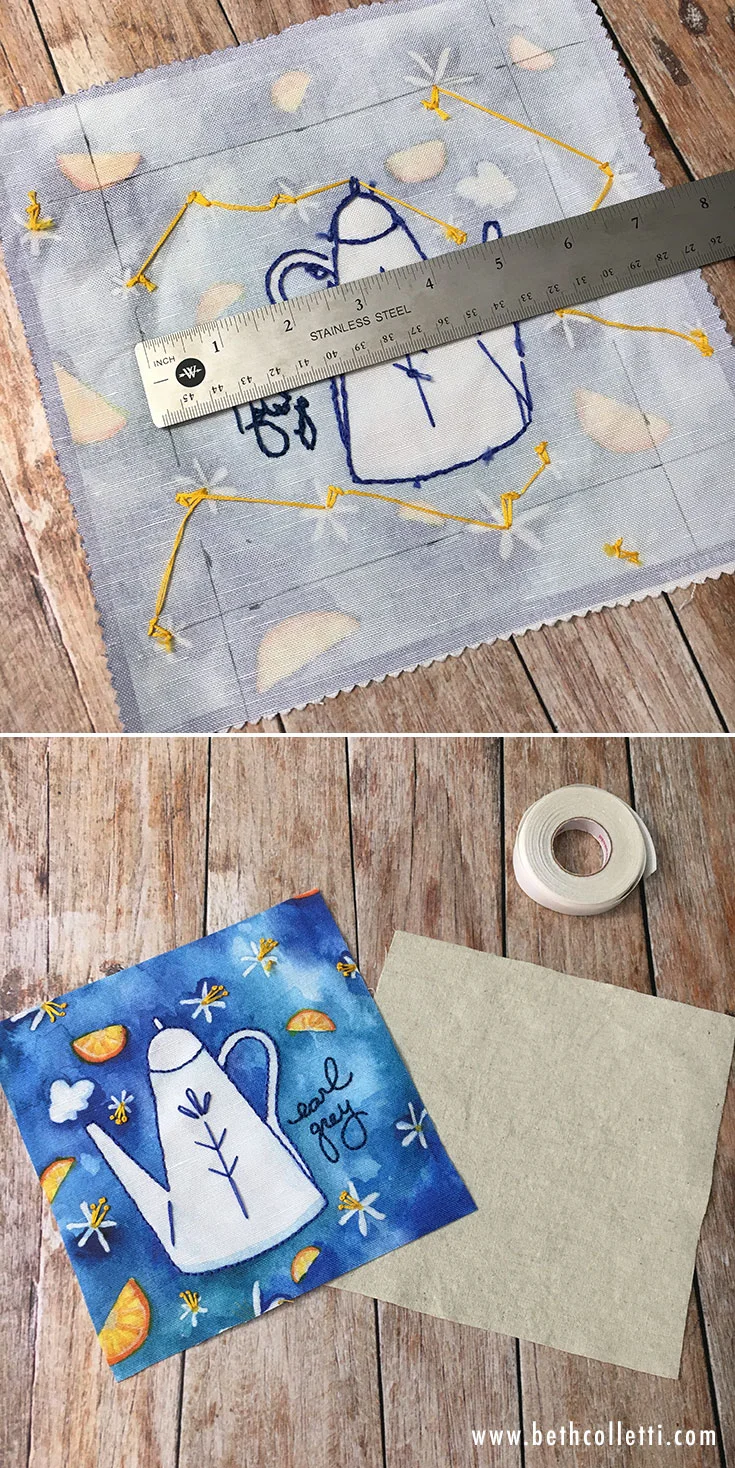 I wanted my sachet to be approximately a 6-inch square so I marked and trimmed off extra fabric to bring my design down to size. Then I did the same with the natural linen I chose for the back of the sachet. If you decide you want your sachet to be a different shape, simply cut out a matching pattern for both the front and the back.