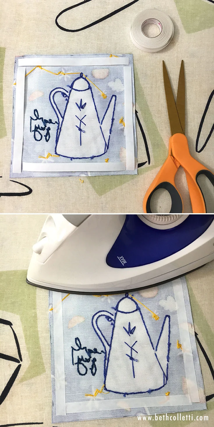 Once my fabrics were ironed and cut, I laid out my embroidery art with the wrong side up so I was looking at the back of the stitches. Next, I cut some HeatnBond® tape for each edge of my square and positioned them slightly away (about ⅛”) from the edge of the fabric before ironing them in place. Each of these strips should be ironed according to the HeatnBond® instructions so they bond to the edges of the embroidery art.