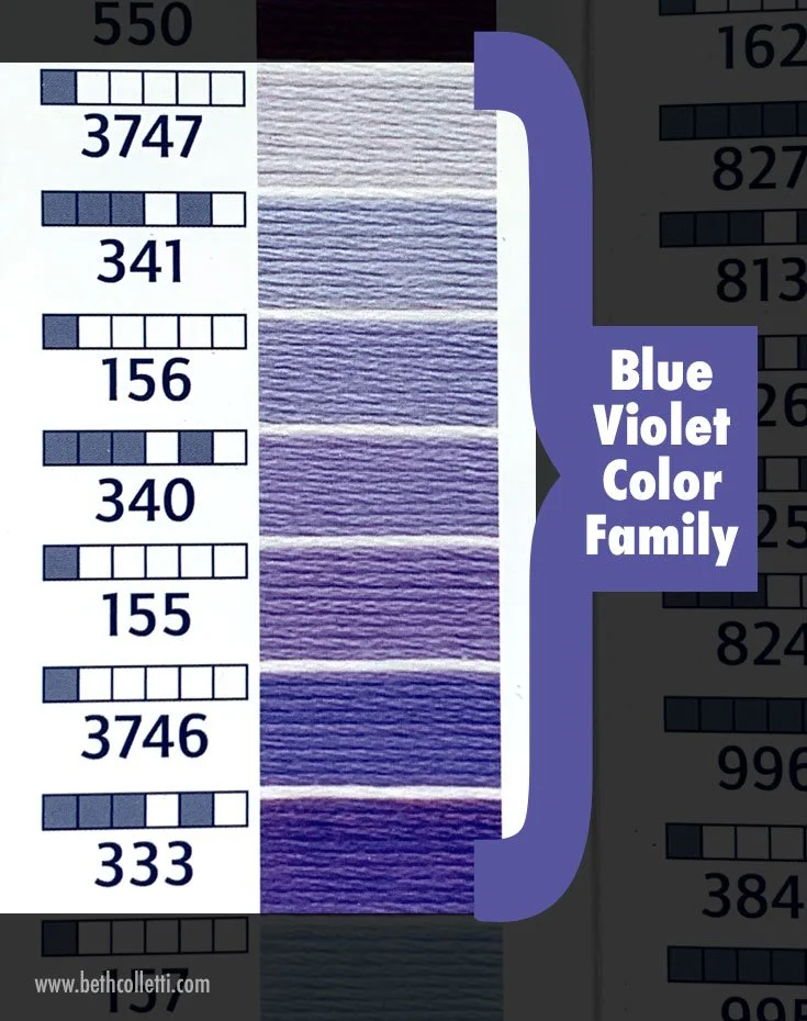 In order to choose colors that work well in an ombré design, it’s helpful to choose threads from one color family. The trouble is when you walk into most craft stores, the DMC thread displays are organized by number rather than color family. That makes it easy to pick out threads if you already know the numbers you want. But it also means that you can stand in front of the display for ages trying to pick exactly the right hues that will work for your project if you don’t know what threads go together in a family. And as DMC adds more colors to their thread line, it’s hard to know where they fit in with their older colors.