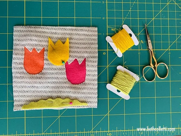 Now the appliqué portion of your coaster is done and it’s time to decorate your felt project! If you want to use batting, pin it to the wrong side of your background fabric and then use your pearl cotton threads to embellish your background, grass, and tulips.