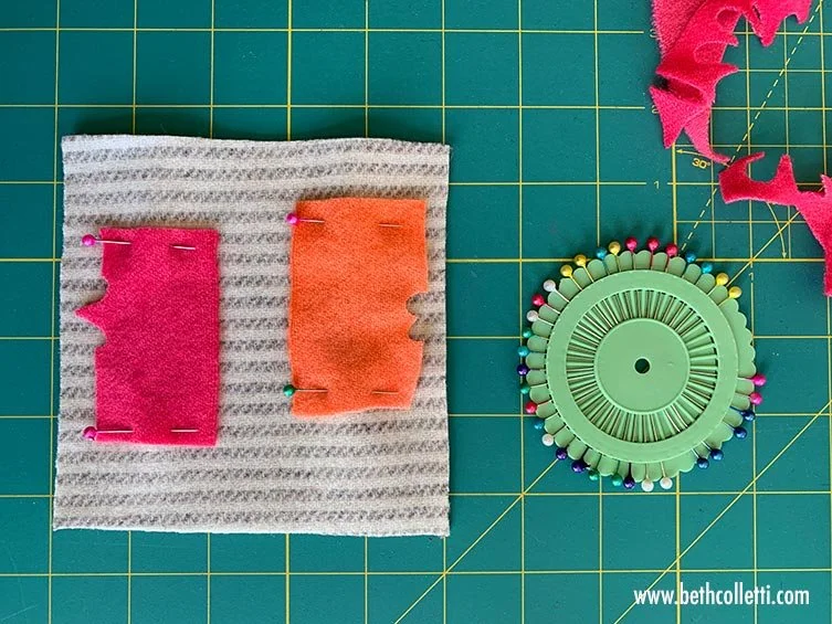Once you’re finished embellishing your design, you can pin your second piece of 5x5” (13x13 cm) felt to the other side of your batting, if using, or the wrong side of your background felt. This piece of felt will cover your batting and the back of your stitches to protect them.