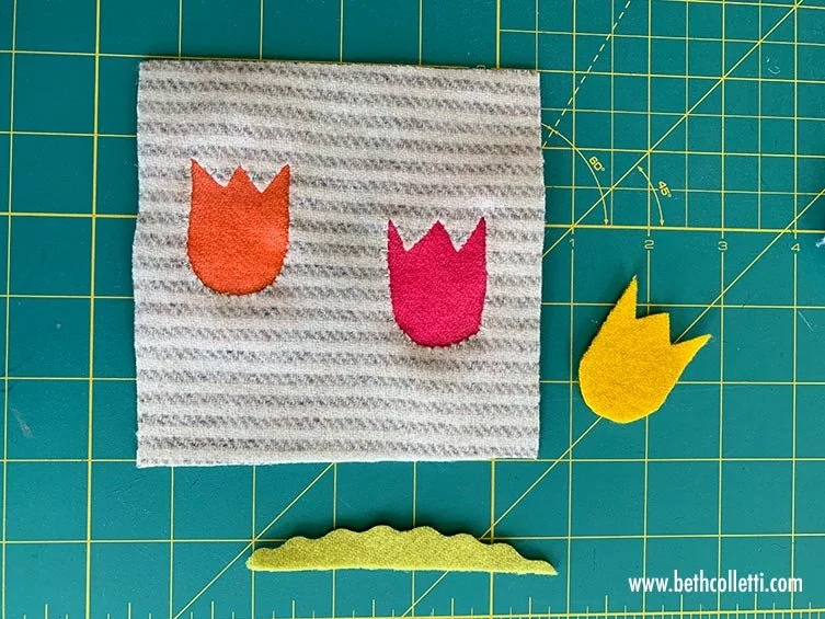 Cut out two rectangles of colored felt approximately 2x2-¼” (5x6 cm) in size. These will go under your background fabric where you’ve cut out two of your tulip shapes.