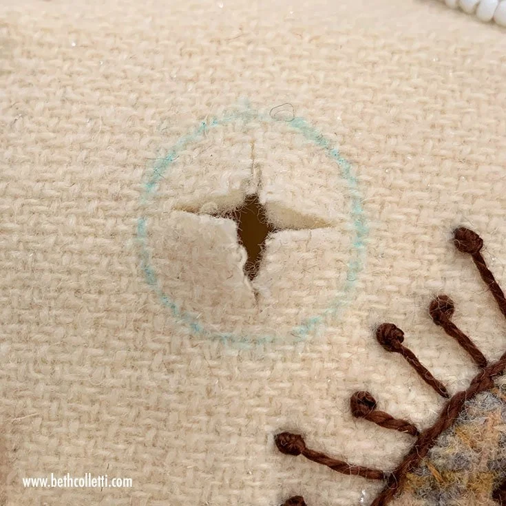 Then use small sharp scissors to remove the pieces from your background; you’ll be left with a hole in your background fabric.