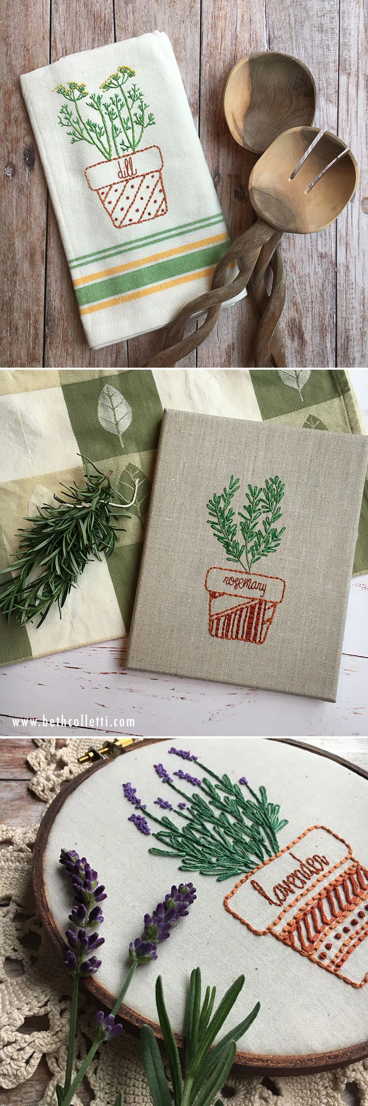 Not only do I love to garden and cook with fresh herbs, I also find herbs really beautiful. As I spent time sketching each of these plants for my embroidery patterns, I was fascinated by the varied textures, shapes and colors in the leaves. Stitching each pattern will provide you with just as much variety as if you were savoring the taste of each herb.