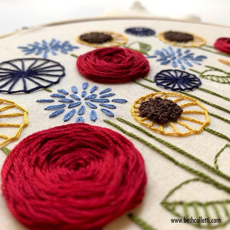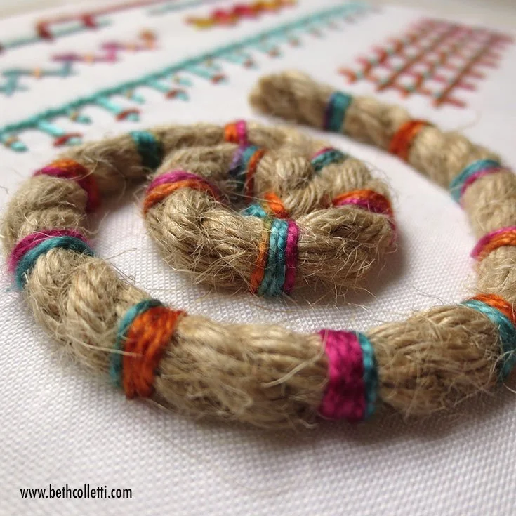 One of six different samplers that I offer in my course, Step-by-Step Stitches for Creative, Textured Embroidery.