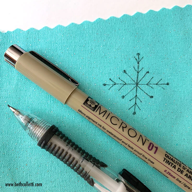 Cons: These methods may not be the best for fabric because they are permanent and you will need to completely stitch over your lines to hide them. Pencil lines can smudge and leave “dirty” marks on your fabric. Micron pens can bleed and may not be color fast so avoid getting your fabric wet if you use them.