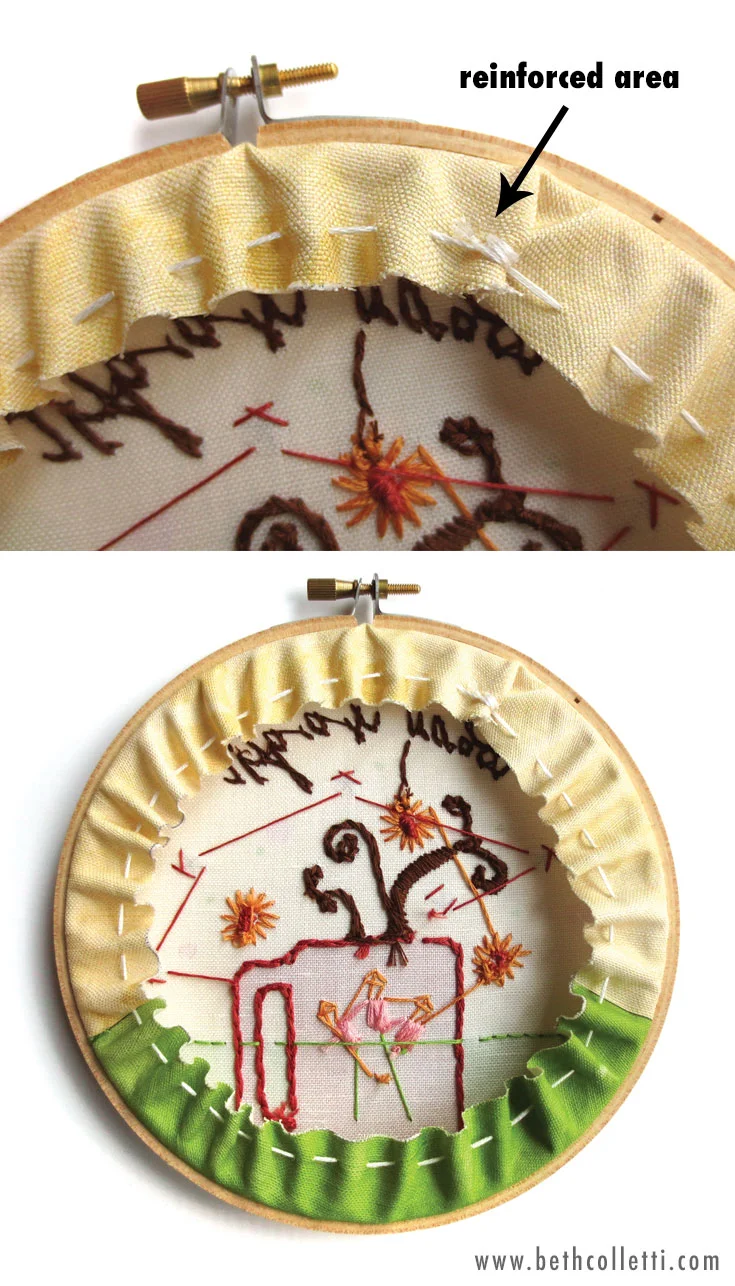 Measure a length of 6-strand embroidery floss about the same as the circumference of your embroidery hoop. This will give you plenty to stitch with. Tie a double knot at one end and thread your needle. Turn the stretched hoop art over so that you are looking at its back. You will be stitching a running stitch around the edge of the overhanging fabric, essentially cinching it together as shown in the photo below. (For a demo of the running stitch visit www.bethcolletti.com/videos)